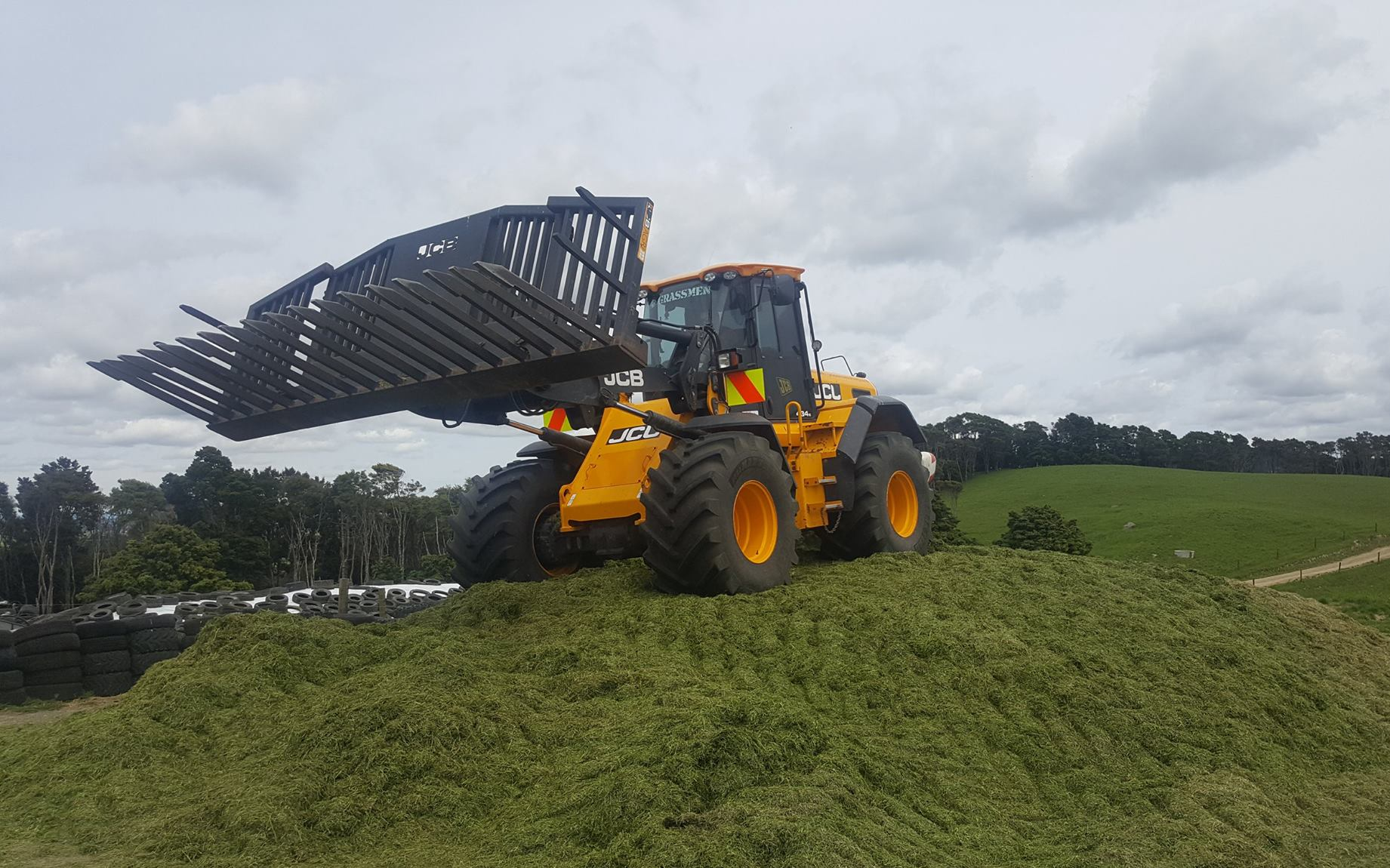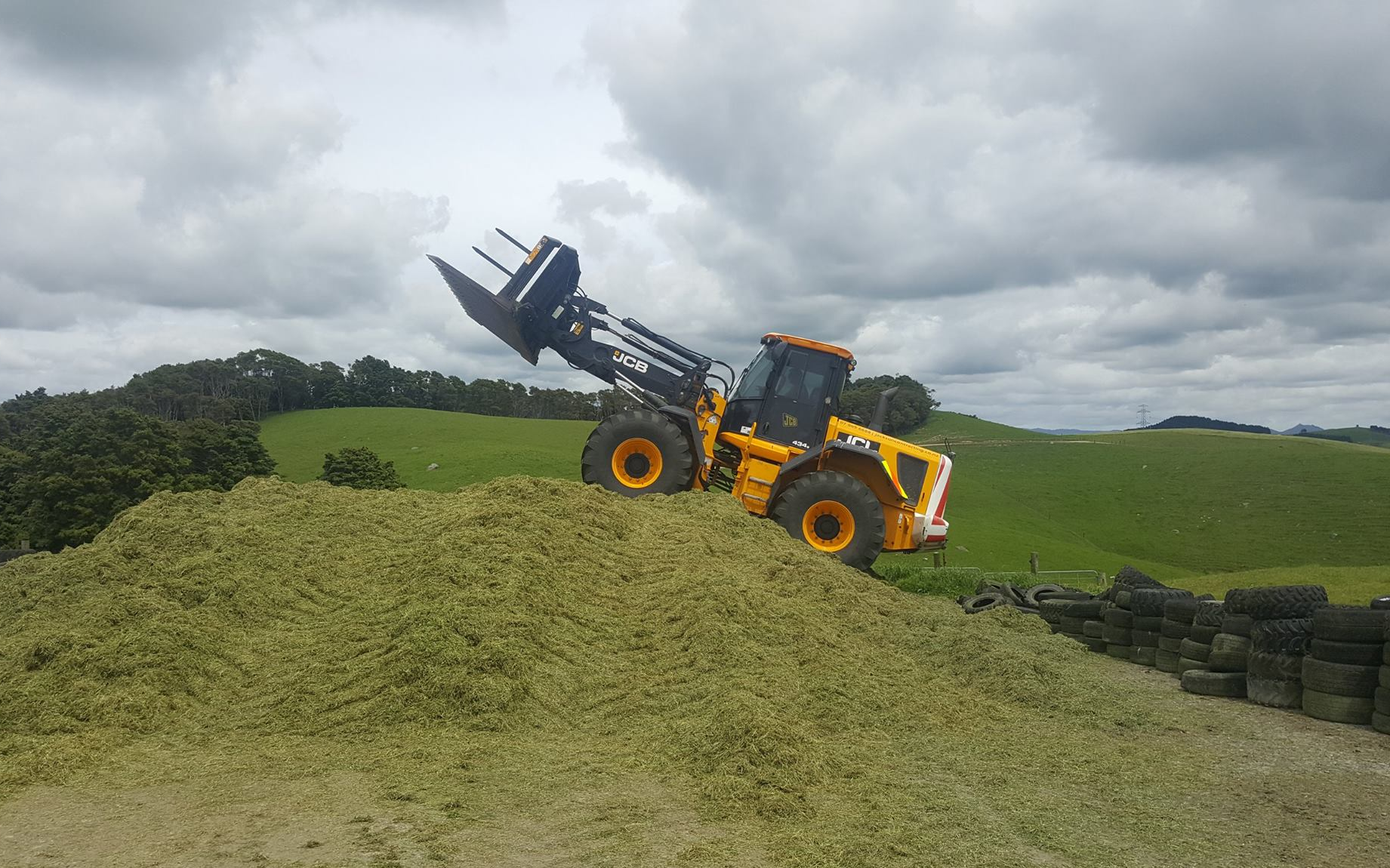 We offer stacked with our JCB 434 wheel loader with a 14′ buckrake.