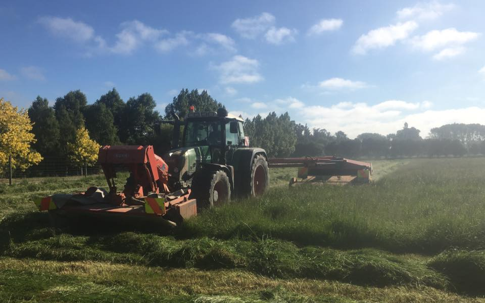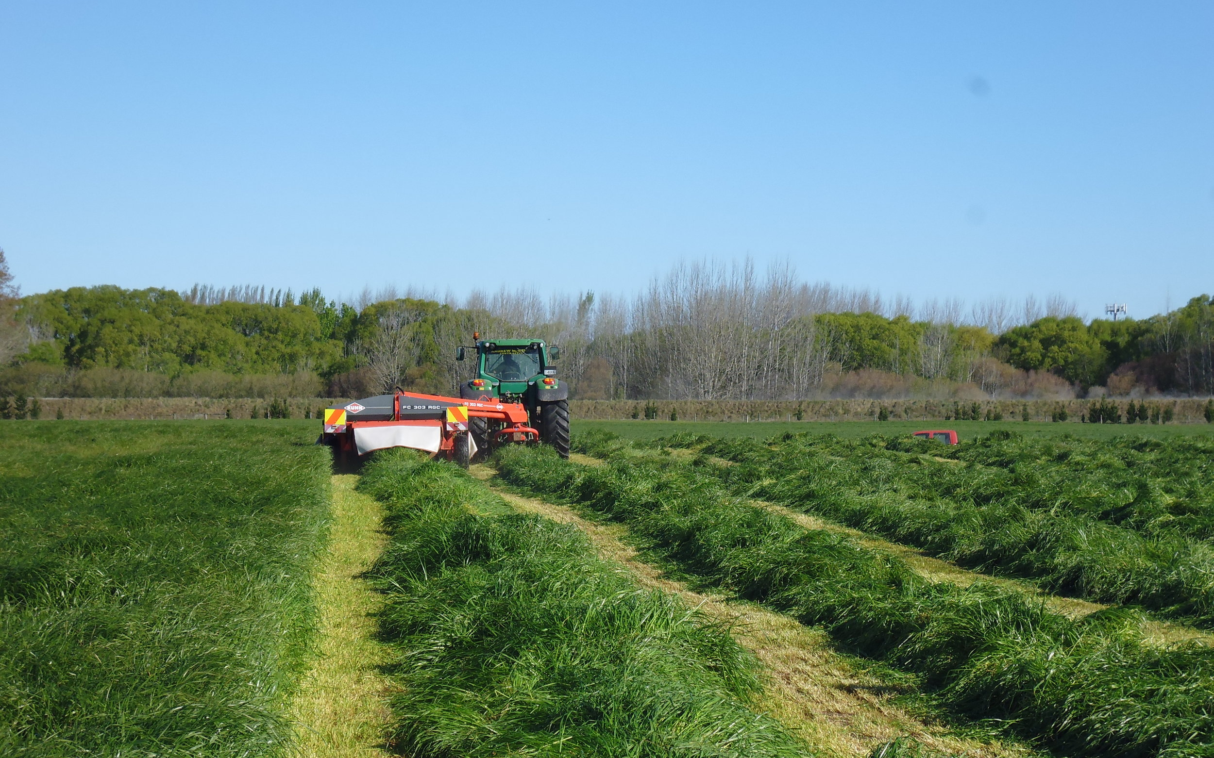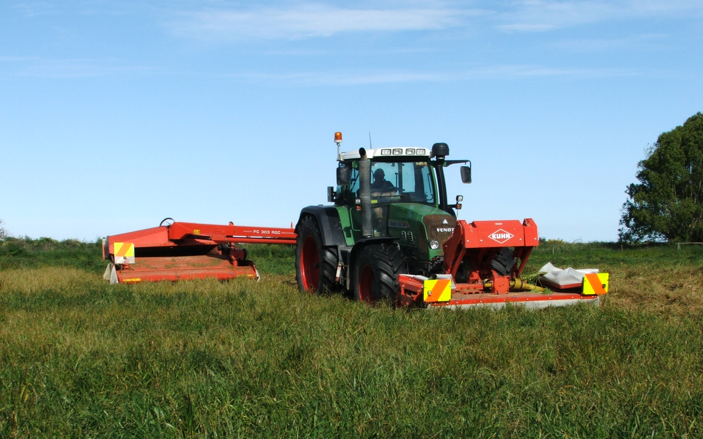 Our mower is a 6 metre Kuhn combination conditioner. Very efficient for getting across paddocks. Heavy crops of grass pose no problem.